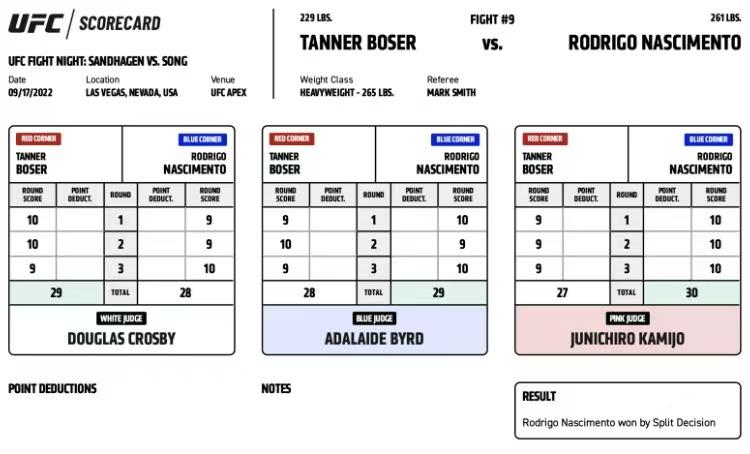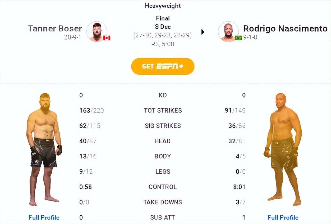 通过赛后技术统计和官方打分卡可以看出,本场前两回合裁判存在分歧。伯泽尔在每个单一回合点数上都占据上风,尤其是第2回合优势明显。纳西门托则总能利用抱摔积累控制时长。个人观点伯泽尔拿下第2回合,纳西门托赢得第1、3回合,以29比28比分拿下判定胜利较为合理。