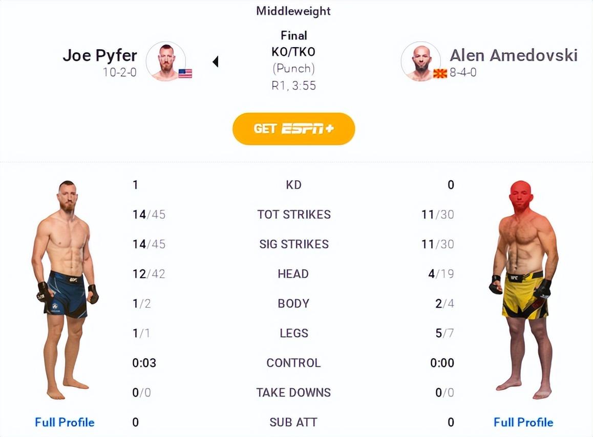 主赛第三场,美国选手“裹尸袋”派弗后手重击一锤定音,于首回合3分55秒TKO终结胜利。 开局阶段,阿梅多夫斯基围绕外线移动,伺机发动低扫消耗。派弗则稳居笼心,压缩对手环绕步路线,还剩约1分钟时后手重击令其应身倒地,兵不血刃迎来UFC生涯首胜。