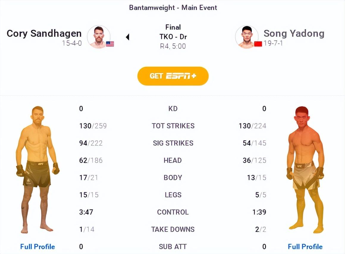 北京时间9月18日月上中天, #UFC 格斗之夜210#暨#UFC Vegas拉斯维加斯 60# 在APEX顶尖会馆点亮激情。 本期一共十三场比赛,共出现5场KO/TKO获胜,2场降服终结。 联合主赛上,巴西“机械战警”格雷戈里.罗德里格斯无视血腥伤口,第二回合TKO力克强敌奇迪.恩乔库阿尼;头条主赛中,我国选手“功夫小子”宋亚东激战四回合,由于面部伤情过重,被场外医疗监督介入终止比赛,以TKO方式不敌美国“睡魔”科里.桑德哈根。以下为 主赛对战全部赛后数据统计及复盘 。