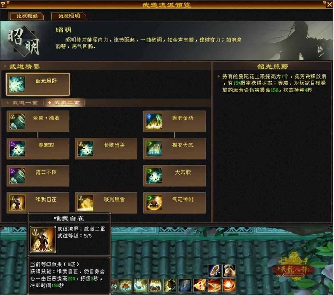 门派特色方面,曼陀山庄拥有高血量以及高暴击量,还可以根据不同情境的需求,来切换不同的角色定位。比如在日常情况下,可以作为远程群体输出角色使用,而在战场之上时,则可以通过不同的技能组合,充当群体辅助或者单体输出使用。