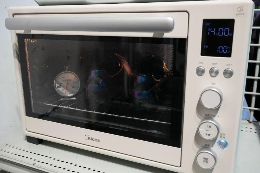 鞋子送进这个美的烤箱,烤出来的鞋子会有鸡翅味(心疼吃锁鞋味鸡翅的小罗……)。留意到烤箱的温度设置在100度,烤20分钟,相比BONT的80度要高不少。