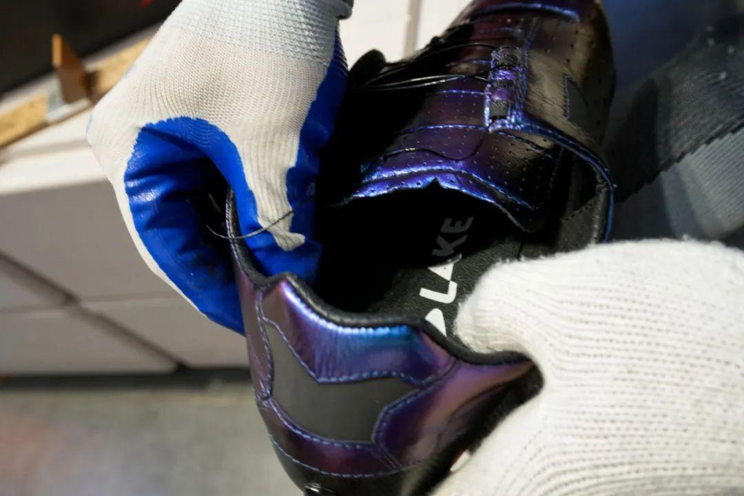 鞋子掰开之后上脚捏造型,鞋杯的贴合是关键。