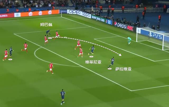 萨拉维亚在锋线上的无球移动还是很积极的,也成功带走了防守注意力。让后场只留3人的本菲卡暴露出空间,也让姆巴佩获得绝佳良机。
