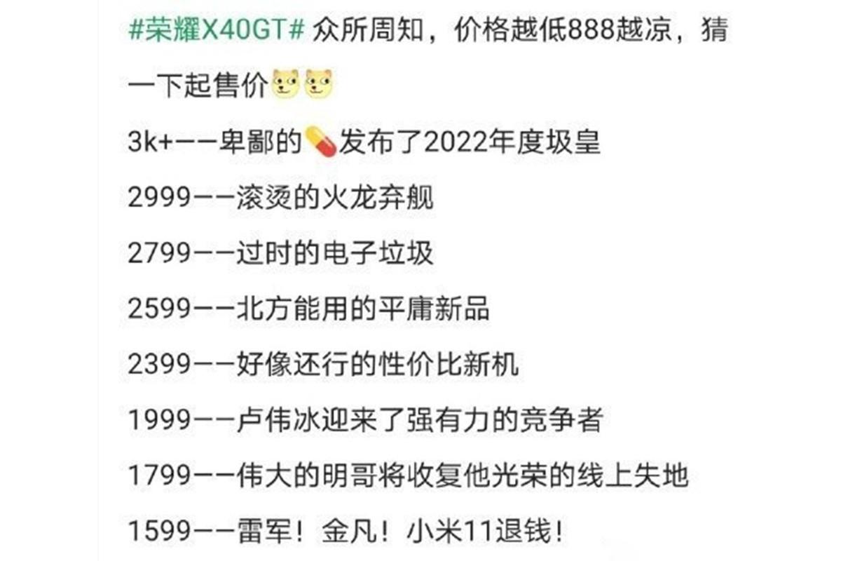 作为一款面向游戏玩家的手机,游戏帧数表现优秀、发热表现优秀,基本上也就不会有什么明显的短板了。而且这是一款LCD屏的机型,荣耀在这款手机上采用了144Hz高刷新率屏幕来满足游戏需求。那还有什么因素能影响到手机的体验呢?答案可能就是价格。有网友表示了荣耀X40GT在各种定价区间下可能会有的口碑,所以手机值不值得买,也就完全取决于定价了。