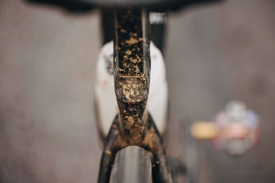 Frei的战车就是这样,她充分利用了Roubaix 33 mm(官方)的胎宽容纳量,在Roval Rapide CLX II 50 mm框高轮组上,搭配了全新的32mm版本Specialized Pathfinder Pro Gravel胎,以获得空气动力学优势。
