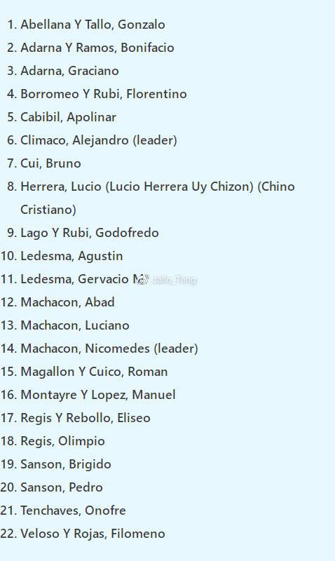 这个人就是编号7的Bruno Cui。关于Bruno我们知之甚少,只知道他出自Cui这个华裔家族,而Cui家则是宿务当地最古老的几个华裔麦仕蒂索家族之一时间可能早于17世纪,按照《妈祖的子民——闽台海洋文化研究》一书描述,早期菲律宾华人主要以海澄县和晋江安平镇为主,因此Cui家祖籍地极有可能是二地之一。另外,Cui是按照西班牙语拼写,发音与英语的Kwee十分相似,因此可能是闽南语的郭。
