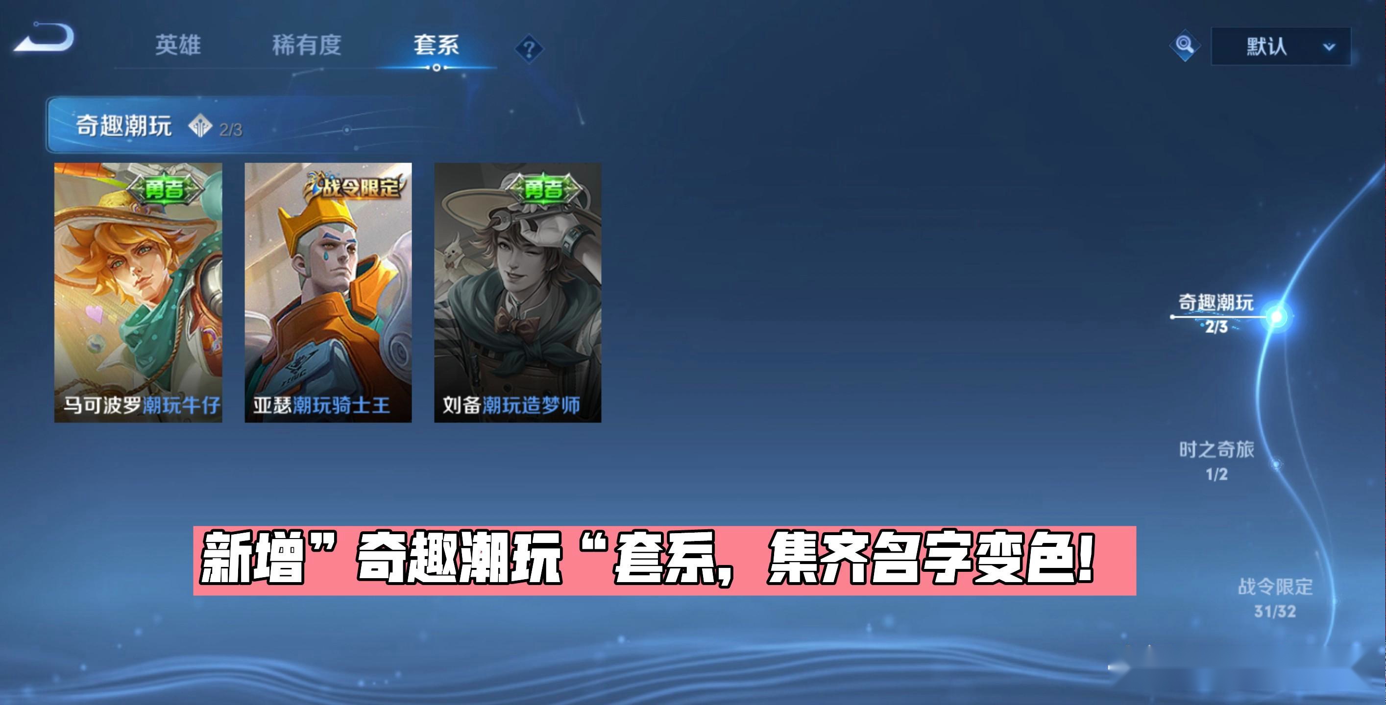 随着刘备新皮肤的上架,皮肤图鉴系统新增“奇趣潮玩”套系,内含刘备——潮玩造梦师、马可波罗——潮玩牛仔和亚瑟——潮玩骑士王三款皮肤。加入同一套系,意味着玩家集齐这三款皮肤便能让匹配Load界面的皮肤名字变成金色显示,同时也预示潮玩系列未来还会加入新成员。