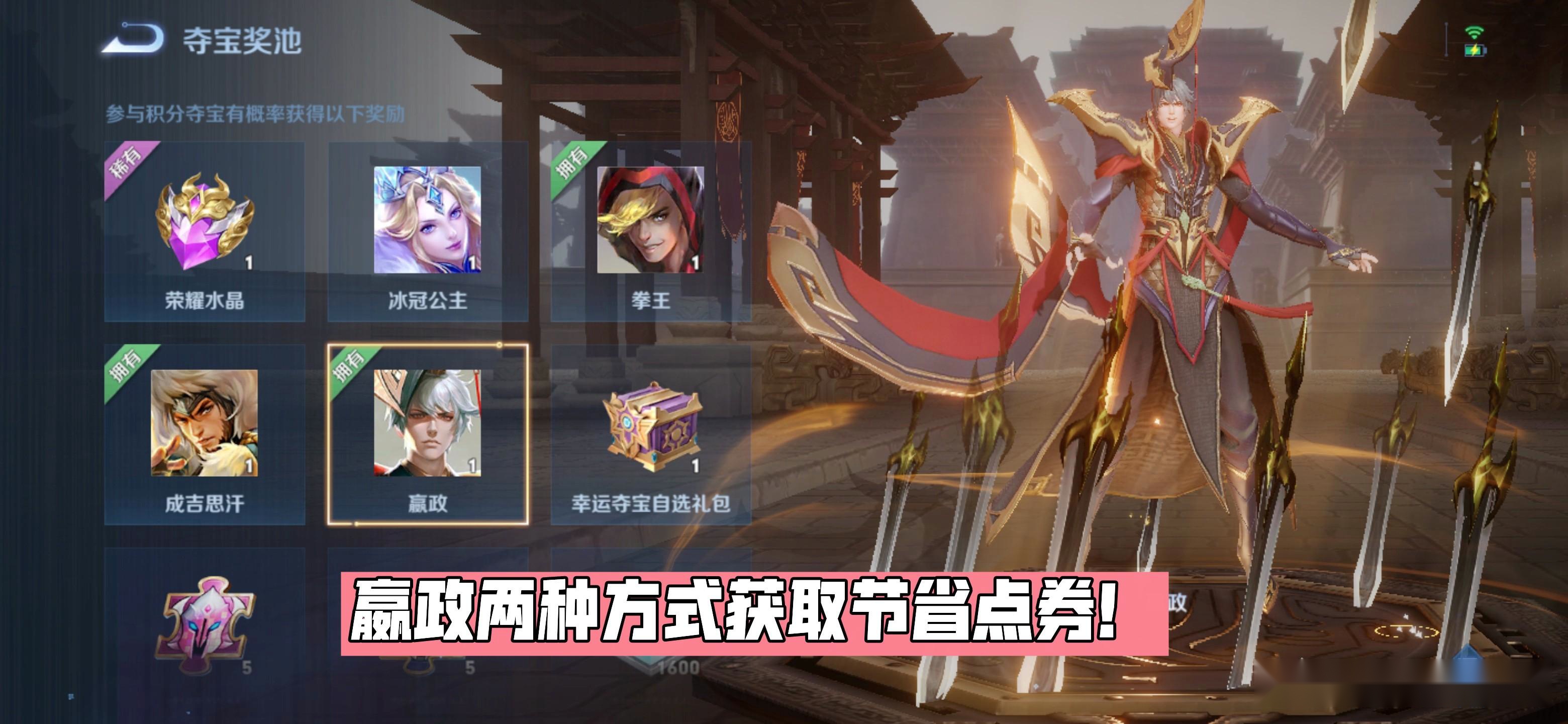 值得一提的是本周的夺宝虽然依旧没有上架王昭君的偶像歌手,但返场上架了达摩勇者皮肤,并且加入了点券英雄嬴政。建议还未拥有嬴政的玩家先别急着参与夺宝抽取,因为周年庆期间有很大几率开启夺宝抽取积分下调和神秘商店福利,届时夺宝获取嬴政能省下不少积分,而神秘商店若是刷出半价和嬴政,那么最低获取仅需344点券。