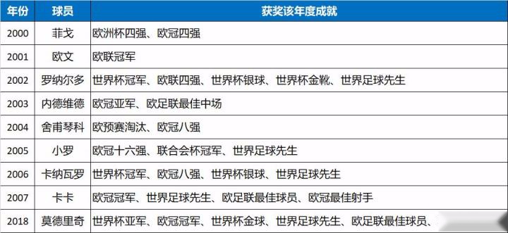 2010和2013年发生的事我就不多说了,大家懂的都懂,我想再稍微 的是骆明那一句“魔笛这个成绩单在历年金球奖得主中也算中上了”。梅罗垄断这十年,大家似乎潜意识里都把金球奖的标准都抬到了球王的位置,因为梅西和C罗的历史地位都已经足以比肩或接近贝利和马拉多纳的高度,但如果你们回看梅罗之前的金球奖得主,就会知道魔笛在历届金球奖得主中水不水了(如下图所示)。