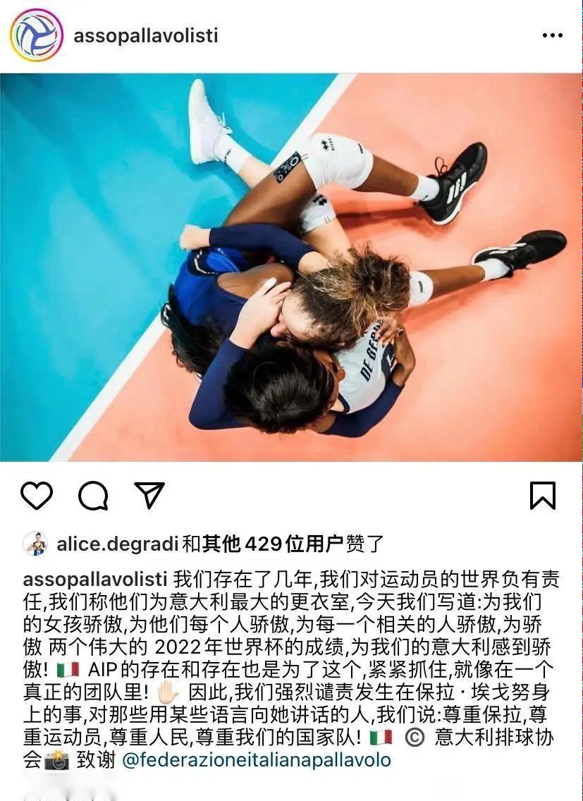 意大利排协发文称,强烈谴责发生在宝拉埃格努身上的事,对那些用某些语言向她讲话的人,我们说:尊重埃格努,尊重运动员,尊重我们的国家队。并称为女排世锦赛的成绩感到骄傲,为每一个国家队的队员感到骄傲。