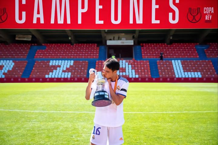 中井卓大在上赛季的高光时刻,无疑是2021-22赛季U19国王杯决赛的绝杀。决赛中皇马2:1战胜西班牙人获得冠军,中井卓大第62分钟替补登场,第95分钟禁区内爆射绝杀对手。