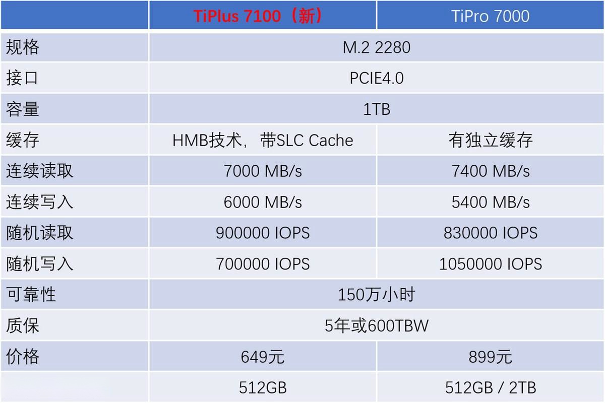 这个系列上市之后,致钛主流固态硬盘产品也就有了三条线,最高端的是TiPro7000系列,主打PCIE4.0、独立缓存规格,主流的是TiPlus5000系列,主打PCIE3.0市场,没有独立缓存。那新推出的TiPlus7100是什么规格呢?它更像是两者融合,面向PCIE4.0市场,但是没有独立缓存。