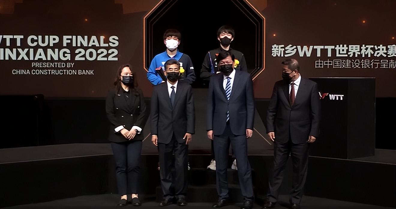 冠军王楚钦登场,现场掌声雷动,他展示冠军奖杯。颁奖嘉宾和张本智和、王楚钦一起合影。