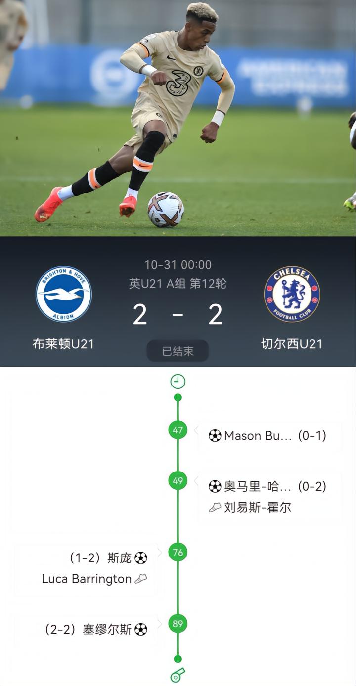 北京时间10月31日凌晨零点,英超二级联赛U21A组第12轮打响,切尔西客场2-2遭布莱顿绝平。上半场双方互交白卷;下半场伯斯托与哈钦森两分钟为蓝军连入两球,斯庞世界波扳回一球,终场前塞缪尔斯为布莱顿上演绝平。