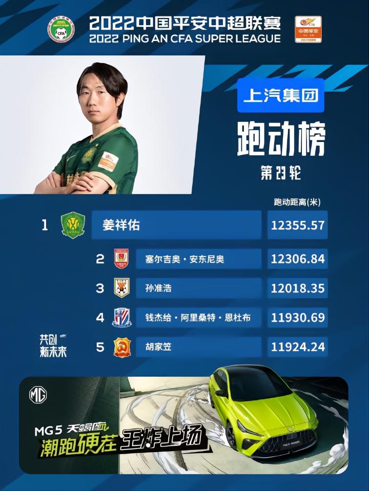 中超官方公布了联赛第23轮球员跑动榜,来自北京国安的姜祥佑位居榜首,长春亚泰的塞尔吉尼奥和山东泰山的孙准浩分列第二、三位。