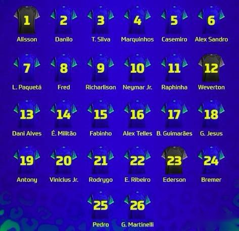 巴西足协公布了世界杯球员的球衣号码,内马尔身披10号,里沙利松穿9号,帕奎塔7号。