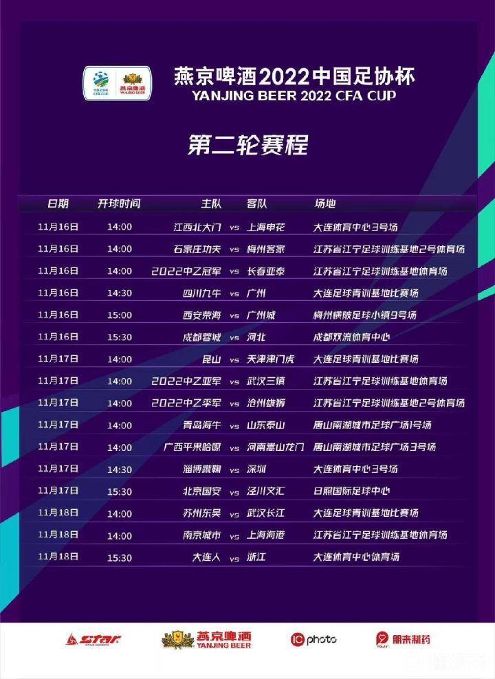 11月11日,中国足协杯官方公布了2022年第二轮足协杯赛程,比赛将于11月16日至18日开打。