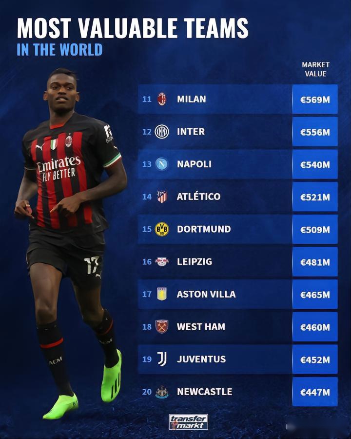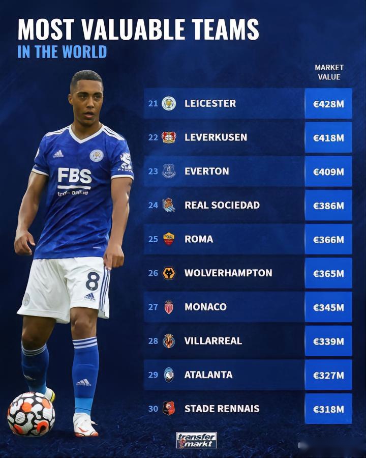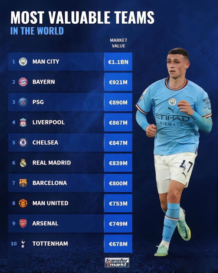 德国转会市场网站日前更新了五大联赛球员的身价,今日,德转公布了世界足坛俱乐部总身价排行榜,曼城以11亿欧居首,拜仁升至第二,巴黎排名第三,利物浦跌至第四。