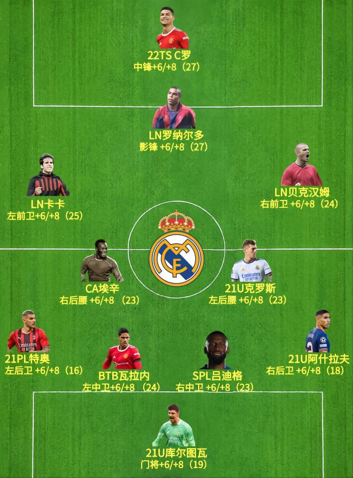『 这里给出一套中高配置的皇马套,各位置球员及赛季的价格相对昂贵些。如果预算不充足,可以根据实际情况,来灵活调整,比如平民玩家可以用EBS C罗替代22TS,边路还能用FA卡卡、21U罗德里戈、EBS阿扎尔等,其他位置同理。 』