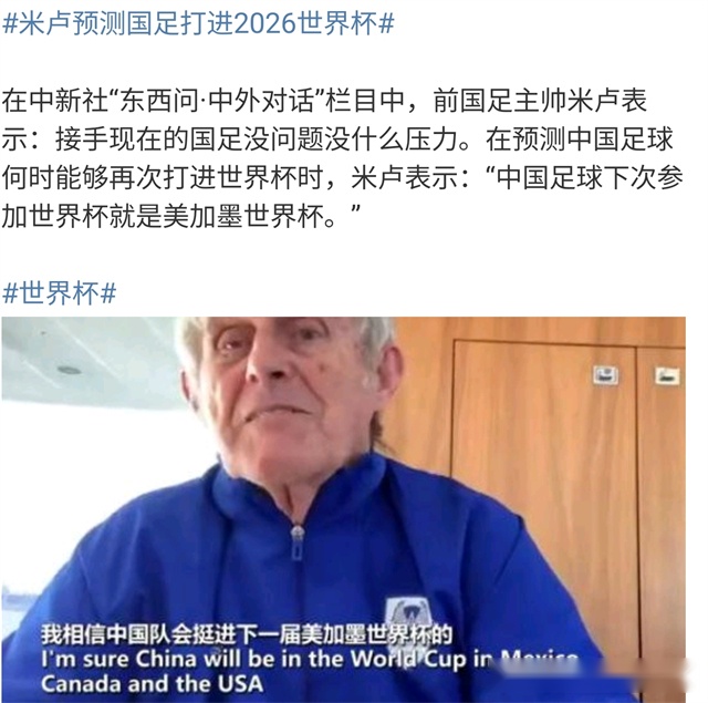 中国球迷在看完沙特队和日本队的爆冷后,也都关注着拥有孙兴慜的韩国队能否打爆乌拉圭,但看完之后,咱们仍会感叹自家的国足哪天也能和日韩一起并肩在世界杯赛场上战斗啊!在中新社“东西问·中外对话”栏目中,前国足主帅米卢在预测中国足球何时能够再次打进世界杯时表示:“中国足球下次参加世界杯就是美加墨世界杯。”