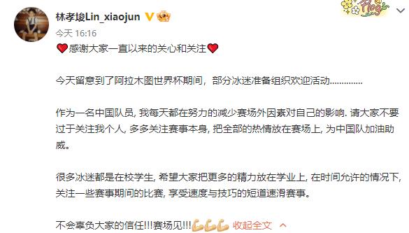 林孝俊在社交媒体上发文,呼吁多关注赛场,学生们不要来接机,更多的还是要将重点放在学业上。林孝俊称自己注意到了在阿拉木图世界杯期间,部分冰迷准备组织欢迎活动,希望大家还是更多的关注赛场,把全部的热情放在赛场上, 为中国队加油助威。