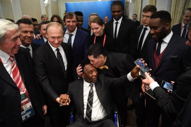 4次参加世界杯,3次夺冠,贝利无疑是世界杯历史上最伟大的球员。球王最后一次出现在与世界杯有关的活动上,是2017年12月1日,作为国际足联特邀嘉宾,在莫斯科克里姆林宫出席2018年俄罗斯世界杯分组抽签仪式。当时77岁的贝利,由于之前的股骨头置换手术不成功,行走已经困难。他坐着轮椅,离开轮椅得拄拐杖。俄罗斯总统普京亲切地与贝利握手寒暄,就连与球王对立成仇的阿根廷前巨星马拉多纳也一释前嫌,搂着贝利,亲吻了他的额头。