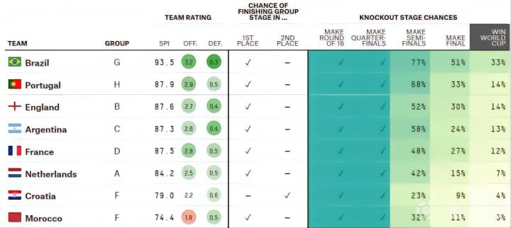 据预测,巴西杀入四强的概率达到77%,克罗地亚仅有23%机会晋级下一轮。葡萄牙晋级可能性为68%,优势比较明显,摩洛哥晋级概率32%。机构评估阿根廷有58%机会晋级四强,而荷兰的可能性则是42%。