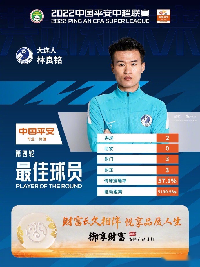 在2022中国平安中超联赛第29轮最佳球员评选中,大连人球员林良铭替补出场,贡献两粒精彩进球,助力队伍取得胜利。