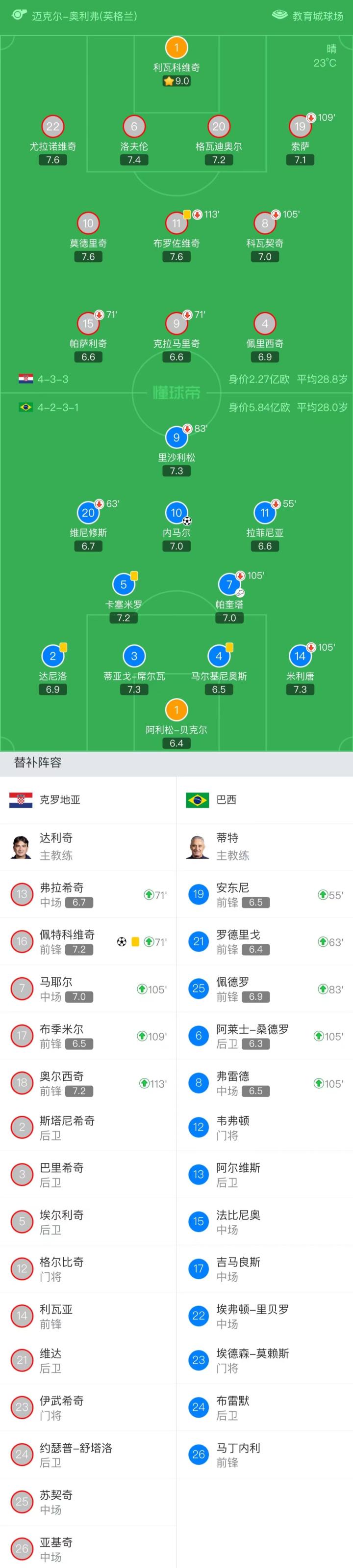巴西首发: 1-阿利松、2-达尼洛、3-蒂亚戈-席尔瓦、4-马尔基尼奥斯、14-米利唐(105'16-阿莱士-桑德罗)、5-卡塞米罗、7-帕奎塔(105'8-弗雷德)、20-维尼修斯(63'21-罗德里戈)、10-内马尔、11-拉菲尼亚(55'19-安东尼)、9-里沙利松(83'25-佩德罗)
