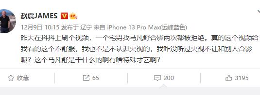 外界主要是不满马凡舒用“纪律”来搪塞,甚至知名记者赵震老师也表示不舒服,称:“一个宅男找马凡舒合影两次都被拒绝。真的这个视频给我看的这个不舒服,我也不是不认识央视的,我咋没听过央视不让和别人合影呢?这个马凡舒是干什么的啊有啥特殊才艺啊? ”