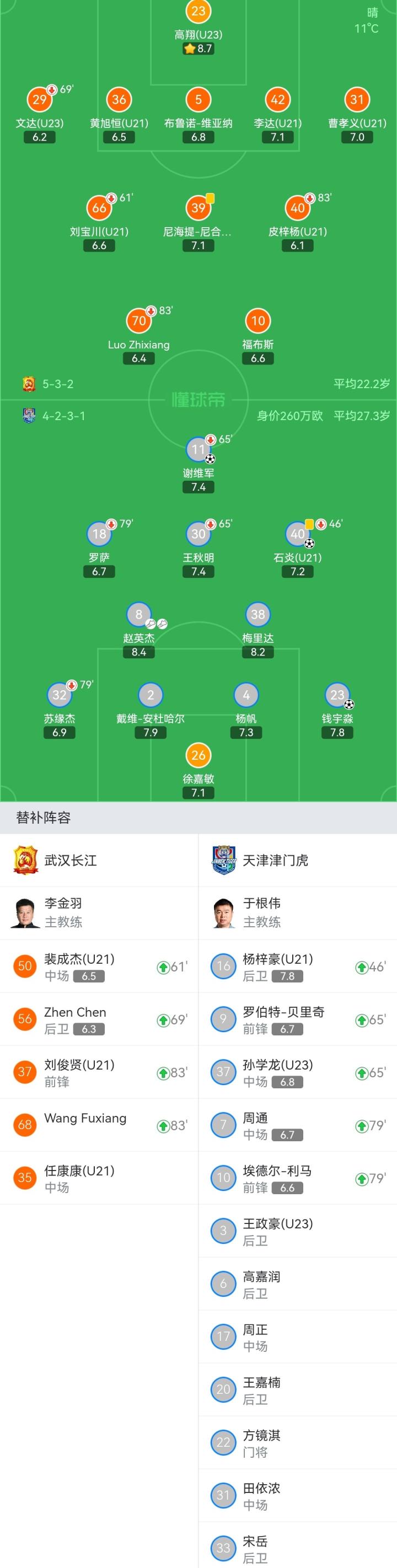 北京时间12月14日17:00,中超第31轮继续进行,武汉长江坐镇主场武汉五环体育中心体育场迎战天津津门虎,本场主裁判为傅明,VAR裁判为王巍。受到队内疫情暴发影响的武汉长江本场残阵出战+从U21队临时上调多名年轻球员凑齐阵容。上半场,赵英杰先后助攻石炎和谢维军头球破门。下半场,钱宇淼同样头球建功,罗萨空门中柱。最终,武汉主场0-3不敌津门虎。