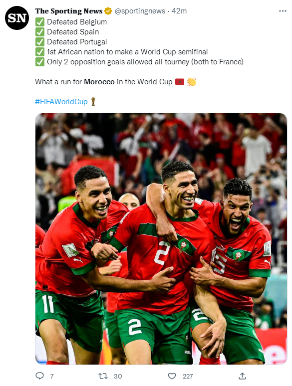 美媒SC则写道:这是一段不可思议的旅程,摩洛哥以小组第一的身份进入淘汰赛,他们击败了三支世界前十的球队(比利时世界第二,葡萄牙世界第9,西班牙世界第七),他们是第一支进入世界杯四强的非洲球队。