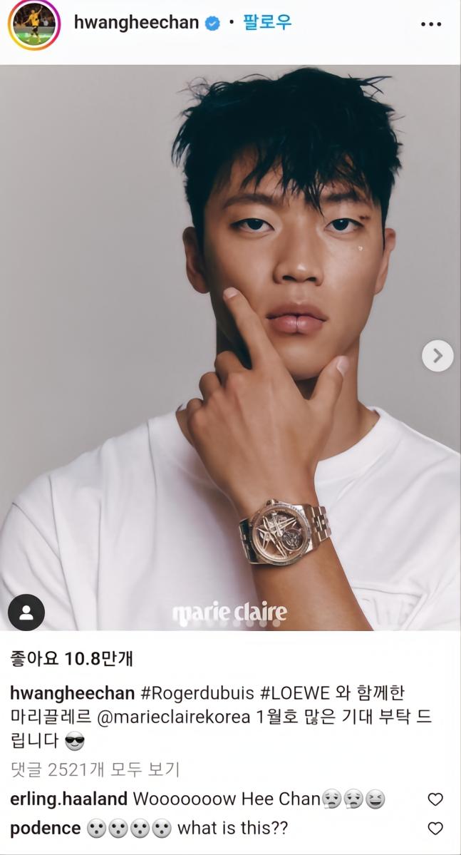 虽然韩国国家队已经结束了2022卡塔尔世界杯的旅程,但是像黄喜灿这样的国家队英雄却依然向球迷散发着令人迷醉的该死的魅力。最近,黄喜灿更是接收到了一大波的时尚界的宣传攻势:西班牙代表性奢侈品牌“LOEWE”为他拍摄了1月号画报,画面中的黄喜灿展现出了十足的性感和坚韧。对自己魅力也是十分有自信的黄喜灿第一时间也将海报分享在了自己的SNS账户上,他曾在萨尔斯堡红牛队的队友哈兰德评论道“哇喔~~~”,同时还附上了一个“惊讶”表情包。世界杯后,黄喜灿很快的就在联赛中复出了;他在联赛热身赛中单骑突围导致对手打入乌龙球,帮助球队4:3赢得了比赛的胜利。“型男”喜灿实力不减,新赛季英超即将拉开大幕,让我们对他的表现拭目以待吧。