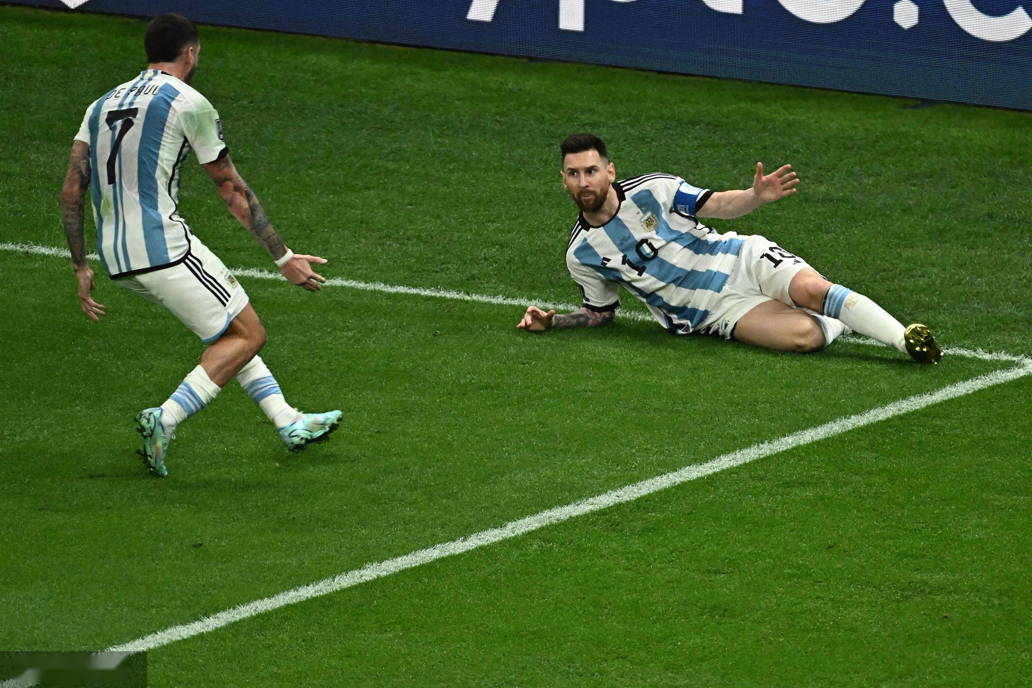 北京时间12月18日晚23点,2022年卡塔尔世界杯决赛,阿根廷对阵法国。上半场比赛迪马利亚制造点球,梅西点球破门,随后迪马利亚进球扩大领先优势。下半场比赛穆阿尼制造点球,姆巴佩将点球罚进之后迅速再入一球将比分扳平,两队在90分钟常规比赛时间里2-2战平。加时赛中梅西和姆巴佩各入一球,3-3,比赛拖进了点球大战。点球大战中姆巴佩和梅西双双射进点球,科曼的点球被扑出,琼阿梅尼射失点球,阿根廷最终总比分7-5战胜法国夺冠,队史第3次夺得世界杯冠军。法国卫冕失败,成为本届世界杯亚军。