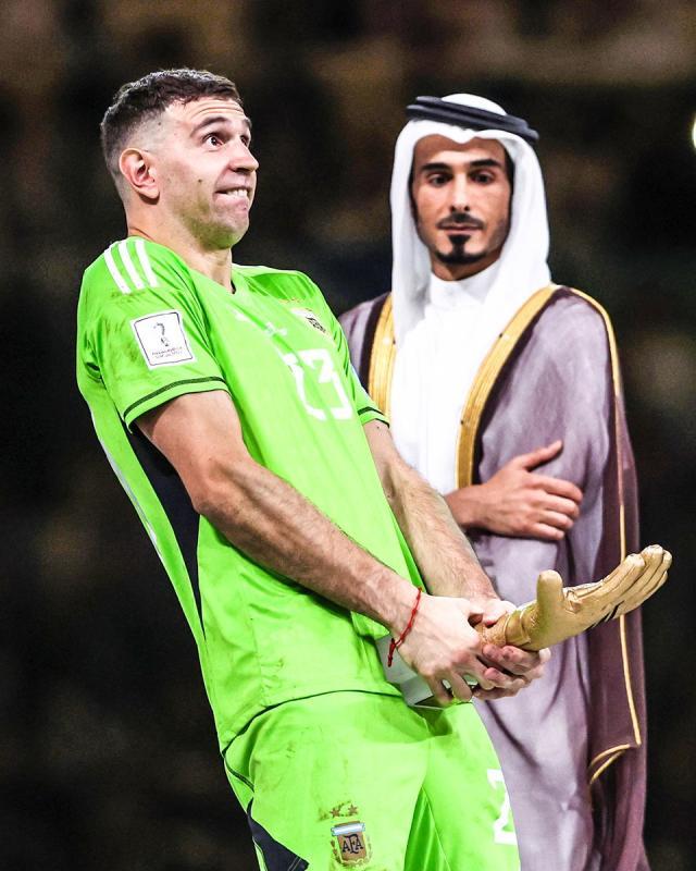 在梅西上台接受顶礼膜拜之前,埃米利亚诺·马丁内斯先接过了代表本届世界杯最佳门将的金手套,只见他走到半路突然将奖杯放到了自己的裆部,龇出大板牙,做出一副“白痴”的表情。这一幕在令人激动的时刻显得如此离经叛道,对卡塔尔皇族来说甚至是惊世骇俗的,但那又怎么样,马丁内斯好像在说:“我的手套就是X!”