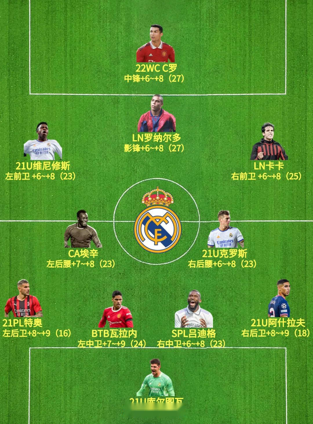 皇马套阵容雄厚,各位置的人数充实,以上阵容仅供参考。如果大家觉得某些位置的选择太贵或不合自己打法,那么可以自行换成更适配的,比如传中较多,边路可以换用LN贝克汉姆、RMA菲戈等,其他位置同理。