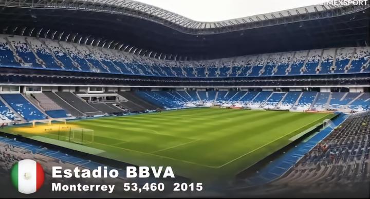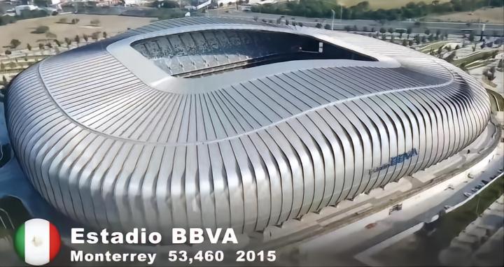 蒙特雷·西班牙对外银行体育场(Estadio BBVA),启用于2015年8月2日,可容纳观众5.3万多,现为墨西哥足球超级联赛球队蒙特雷的主场。设计灵感来源于当地酿酒和钢铁制造的历史,该体育场的自支撑三脚架结构打造出了雕塑般的形式,两侧是包覆铝材的轧制 钢桁架,向当地的钢铁厂致敬。55米的巨大结构悬臂式屋顶,则保证了体育场内最大的舒适度和遮阳度。