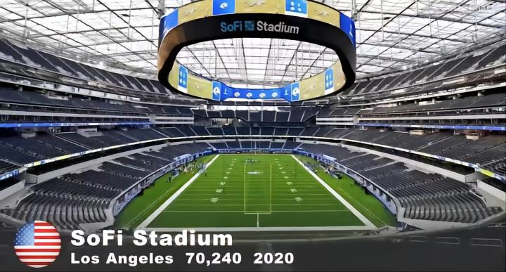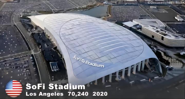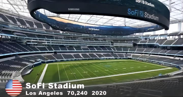 SoFi球场,启用于2020年9月8日。可容纳7万名观众,并在需要时可扩容至10万人。据报道,SoFi球场投资估计超过50亿美元,现为美国国家橄榄球联盟球队洛杉矶公羊以及洛杉矶闪电的主场。使球场体验独一无二的技术包括一个 70,000 平方英尺的 Oculus 显示板,该显示板将具有 4K 双面视频,大多数座位都可以看到看板的正面和背面。 Wi-Fi 6,提供更快速度的下一代无线技术;虽然 SoFi 体育场拥有 NFL 中最轻的结构屋顶之一,但它仍然悬挂着世界上最大的中悬式视频板。