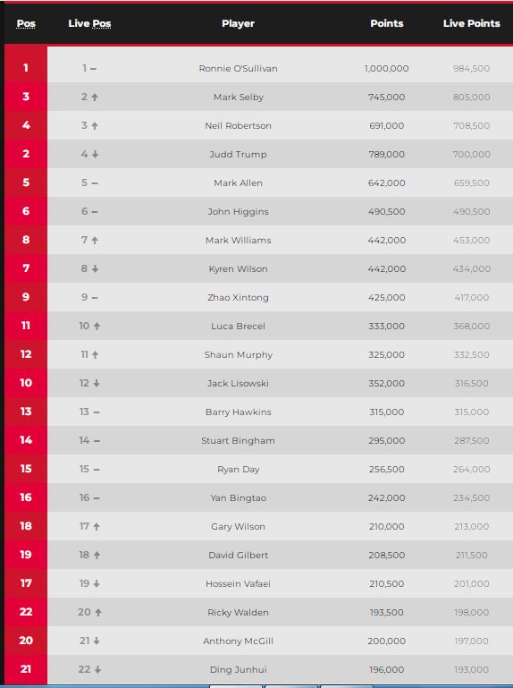 英格兰公开赛结束之后,世界排名方面,塞尔比以805,000(约合人民币6853557元)英镑积分,上升到第2。丁俊晖以193,000(约合人民币1633397元)英镑积分排在第22,奥沙利文则以984,500(约合人民币8356421元)英镑积分牢牢排在第一。