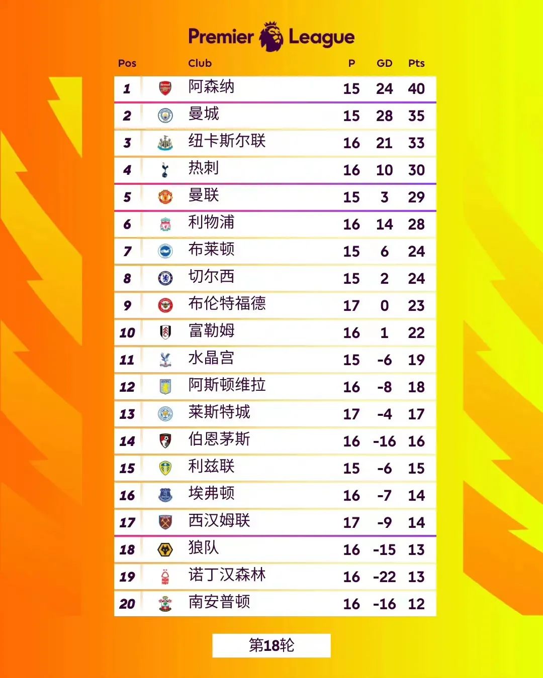 纽卡豪取6连胜,排名第3;利兹联上一轮输给曼城,排名第15。
