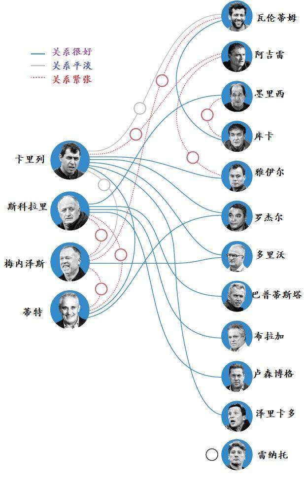 巴西《圣保罗页报》曾做过一个有趣的关系网图,在这张图里可以看到,斯科拉里关系较好的同行都是他的同时代人,例如卢森博格、阿贝尔·布拉加、墨里西等,年轻一代的主教练,要么和斯科拉里没有关系,要么和斯科拉里关系紧张。