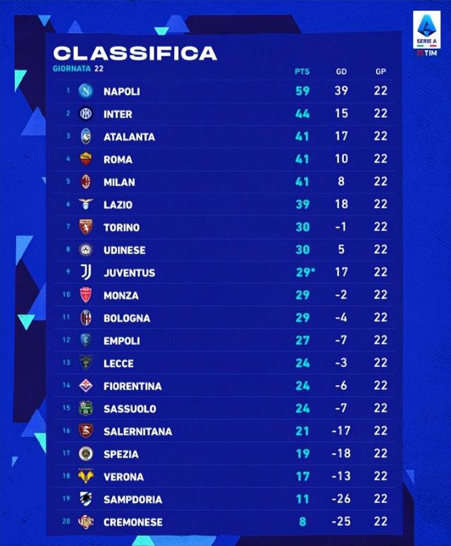 面对意甲倒数第2的桑普,国米只收获了1分,但他们仍然能以3分优势,力压亚特兰大、罗马和AC米兰,坐稳意甲第2的位置。 而本轮主场3-0轻取垫底球队克雷莫纳后,那不勒斯已经取得6连胜,现在他们的领先优势从13分变成15分。