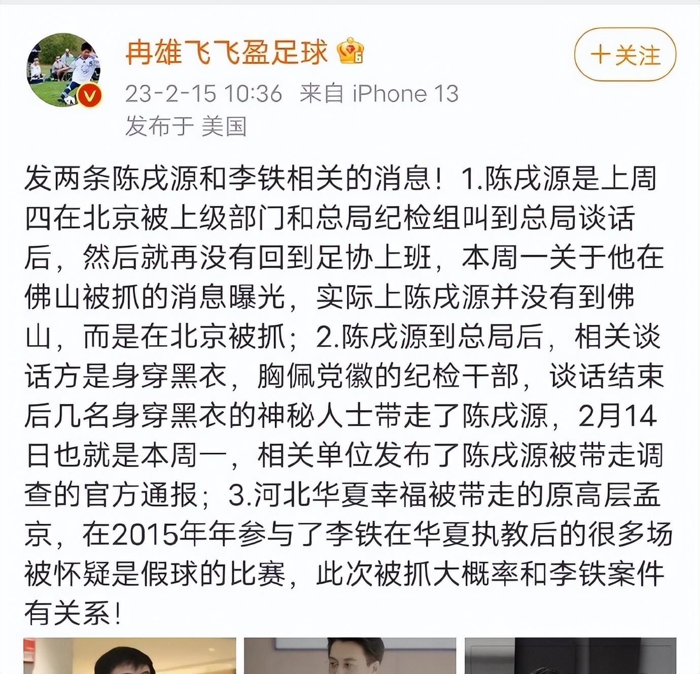 随着陈戌源被抓,这位足协主席的被逮捕全过程遭曝光,媒体人冉雄飞透露陈戌源在前一周的周四(2月9日)就被官方纪检组人员叫去谈话调查,随后便没有回到足协上班,期间旷工失联多达4天,2月14日足协高层在佛山开展国足选帅会议,陈戌源依旧缺席,最终被官方通报涉嫌严重违法违纪直接被抓。