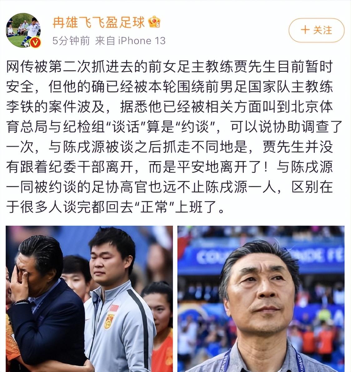 此前中国足坛发生了不少震惊球迷的事情,足协主席陈戌源被中纪委和湖北监委带走调查,随着码头陈的倒台,许多曾经和陈戌源关系不错的足坛人士也因此被调查。而近期网上也是流传出有关于前中国女足主教练贾秀全被带走调查的消息,不过一直没有确切的消息传出。随后资深足球媒体人冉雄飞就通过社交媒体透露,其实贾秀全确实在近期被纪委约谈,不过与陈戌源不同的是贾秀全安全离开了。