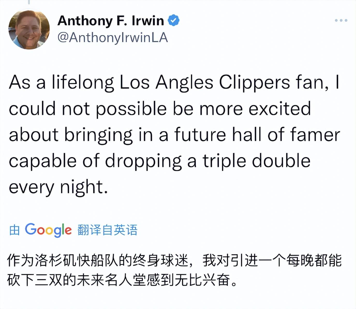 洛杉矶快船的终身球迷安东尼已经在推特上欢迎少爷加盟:“作为lac的终身球迷,我对引进一个能场均三双的名人堂球员感到无比的兴奋。”