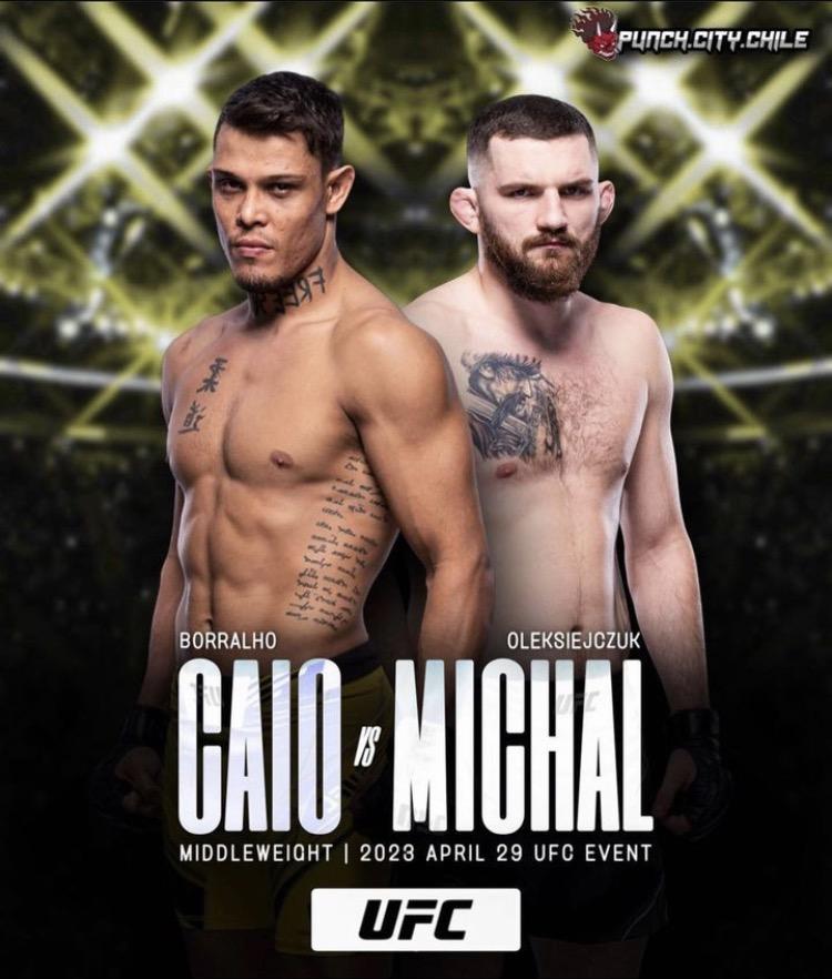 一场中量级对决:巴西选手“天生好手”卡约.博拉略(13胜1负1无结果)VS.波兰选手“轻骑兵”米哈乌.奥勒斯耶祖克(18胜5负1无结果),比赛将于4月29日的格斗之夜上举行。