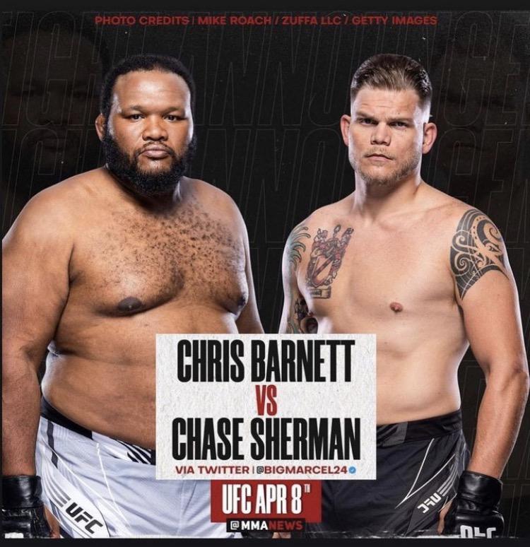 一场重量级美国内战:“抱抱熊”&“野兽男孩”克里斯.巴尼特(23胜8负)VS.“白化大猩猩”蔡斯.舍曼(16胜11负),比赛将于4月8日在美国迈阿密召开的UFC 287上举行。