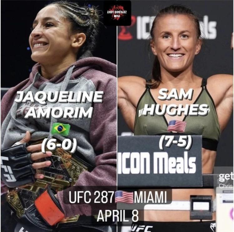 一场女子草量级对决:巴西首秀新人“雅克/Jacque”杰奎琳.阿莫里姆(6胜0负)VS.美国选手“狂飙/Sampage”萨姆.休斯(7胜5负),比赛将于4月8日在美国迈阿密召开的UFC 287上举行。