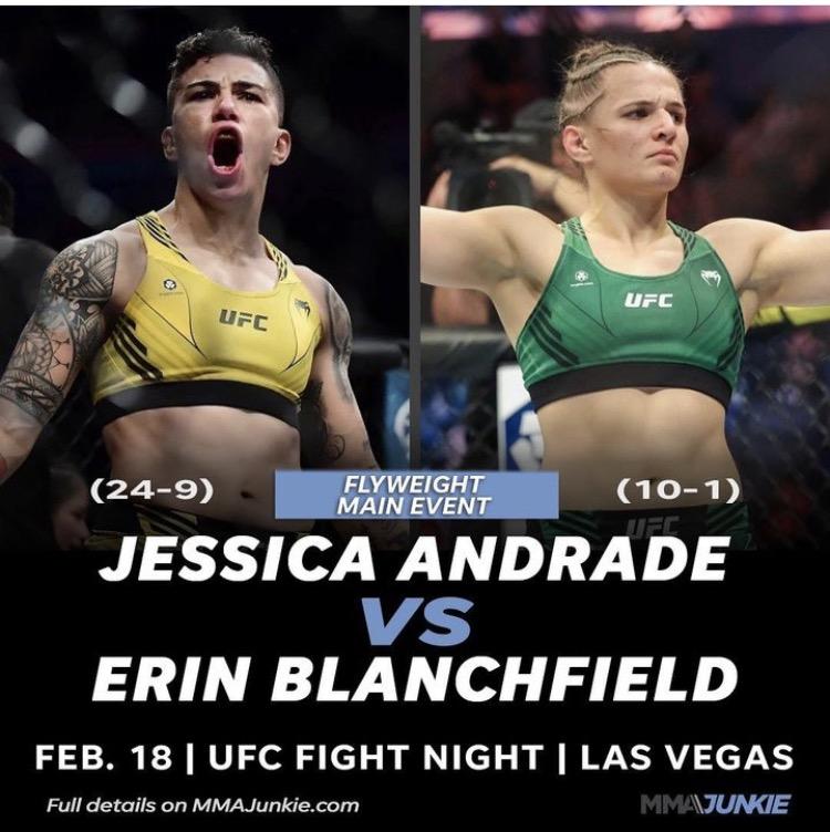 由于泰拉.桑托斯,受困于教练组成员的赴美VISA签证问题选择退赛。现排名第十的美国选手“冷血”埃琳.布兰奇菲尔德(10胜1负)将在女子蝇量级,面对超紧急替补现排名第三的巴西选手“打桩机”杰西卡.安德拉德(24胜9负),比赛将于北京时间2月19日的UFC 拉斯维加斯69 上作为头条主赛领衔举行。