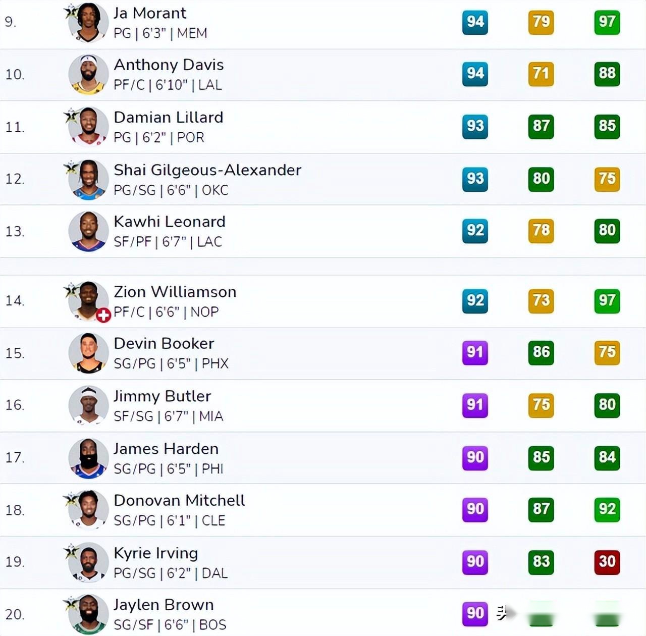 第9-第20名能力值都达到了90,他们分别是莫兰特(94)、浓眉哥(94)、利拉德(93)、亚历山大(93)、伦纳德(92)、锡安(92)、布克(91)、巴特勒(91)、哈登(90)、米切尔(90)、欧文(90)和杰伦布朗(90)。